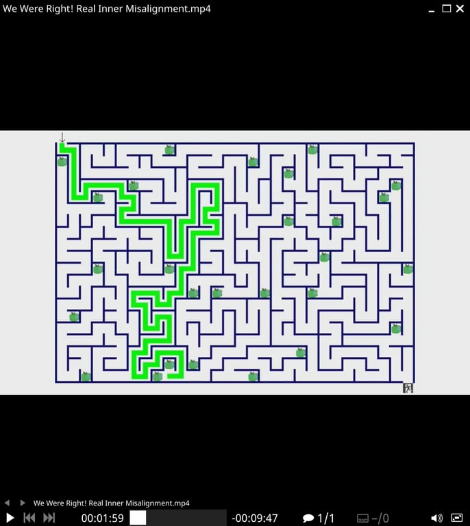 However, when the environment changes, this new environment may contain green objects. The resulting behavior is that this agent is now competently traversing the maze to go to the green apples instead of going to the exit sign.